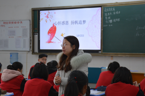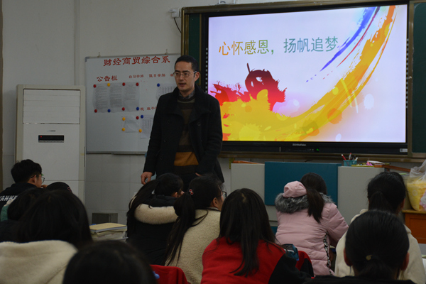 为了进一步弘扬中华民族传统美德,树立社会主义核心价值观,推动学生思想道德建设,2月25日上午第一课,财贸系各班开展了“心怀感恩、扬帆追梦”主题班会活动。