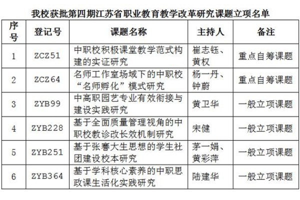 近日,江苏省教育科学研究院发布了《第四期江苏省职业教育教学改革研究课题立项评审结果的通知》,我校6项课题获准立项,其中,重点自筹课题2项,一般立项课题4项。 省级教改课题项目是推动教育教学改革、提高教育质量的重要举措,其立项数量和质量体现了省内各校教学教研水平。根据《关于组织开展第四期江苏省职业教育教学改革研究课题申报工作的通知》(苏教科院科〔2018〕31号)和《江苏省职业教育教学改革研究课题管理办法》(苏教科院〔2010〕6号)的有关精神,经过组织申报和省专家的评审,共评选出第四期省职业教育教学改革研究课题489项,其中:职教改革发展委托课题5项,重点资助课题30项、重点自筹课题76项、一般立项课题378项。 近年来,我校围绕立德树人的根本任务,坚持走以质量提升为核心的内涵式发展道路,创新人才培养机制和模式,加强专业内涵建设,深入开展课程建设和研究性教学改革,不断强化实验实践教学,人才培养质量稳步提升。学校将以此次获批立项为契机,加强教改项目指导和过程管理,积极引导和支持广大教师和教学管理人员探索教育教学改革面临的新课题,不断提升学校教育教学研究水平。(徐杨帆)