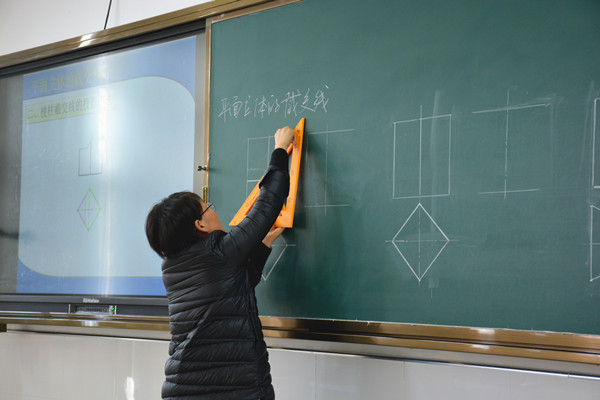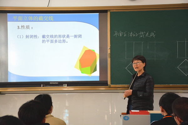 3月19日上午第二课,谢丹老师在18JD01开设了一堂校级公开课《平面立体的截交线》。机电系李菲飞主任和倪海峰、陈宇洋科长携同陈炯、倪慧娟、于海艳、仇凯翔、陈元达和吴田喜等老师到场听课并参加了评课活动。
