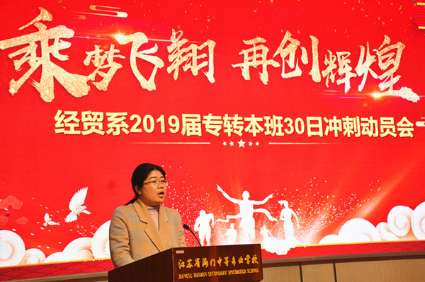 拳拳寄语声,厚载恩师情。动员会进入了沸点时刻!经贸系主任施红华向全体专转本学生发出了30日冲刺令,为学生们送上真诚的祝福和美好的祝愿。她要求同学们在最后短短的30天里要激流竞渡,奋勇前行,以理想为彼岸,脚踏实地,用最强劲的力量将拼搏进行到底。