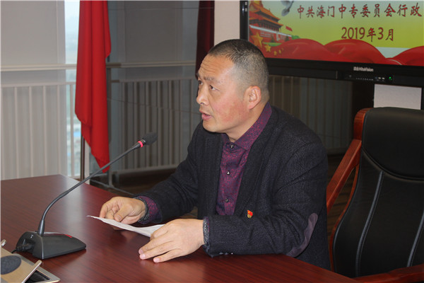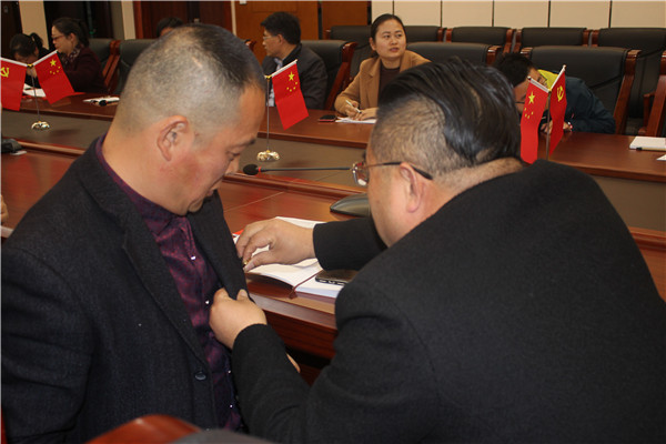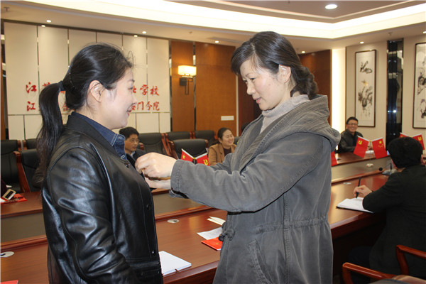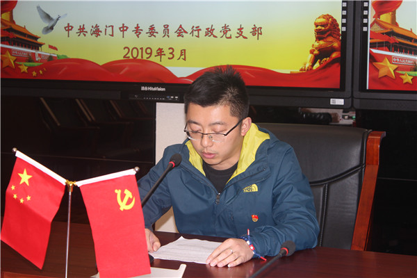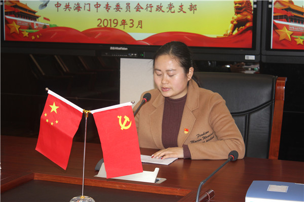 3月21日下午,行政党支部在A楼12楼谷歌厅举行3月份“主题党日”活动。会议由支部书记洪龚明主持。根据海门市委组织部3月主题党日活动要求,结合支部实际,本次统一活动主要安排五项议程。 首先,由支部书记洪龚明组织支部党员学习《共和国是红色的!习近平今年两会这样谈“初心”》。“共和国是红色的,不能淡化这个颜色”、“艰苦奋斗、勤俭节约的思想永远不能丢”、“要饮水思源,决不能忘了老区苏区人民”……习近平多次谈到“初心”,引人深思。 会议的第二项议程是学习规范佩戴党徽。洪主任首先向全体支部党员介绍了党徽的佩戴位置。洪主任指出,党员徽章应佩戴在左胸中间位置,靠近心脏的地方,不得使用破损、污损、褪色或不符合制作规定的党员徽章。接下来,支部党员相互协作、规范佩戴党徽。推行规范佩戴徽章,有利于引导党员主动亮明身份,强化其党性观念、使党员同志更好立足岗位服务群众。 会议的第三个议程是“谈初心”交流活动。支部党员赵建平、陆晓曦、江金丹分别发表感言。大家在学习中感受到在习近平新时代中国特色社会主义思想引领下中国正在蓬勃发展。作为普通党员,我们也深深地感受到了“我们什么样,中国就是什么样”,我们要立足本职岗位,尽心尽力,为学校发展尽绵薄之力! 会议的第四个议程是晒晒“学习强国”APP学习成绩单。洪书记指出,大部分党员同志能够循序渐进每日学习。通过学习,能丰富和开阔视野、不断与时俱进,这是一举多得的好事情,他勉励大家保持良好的学习习惯。随后积分较高的茅一娟、杨云等同志分享学习经验。两位同志分享了“宜早不宜晚、活跃时段要多学、不同板块兼顾学”等有效积分的心得体会。 会议的最后一项议程是关于庆祝建国70周年行政支部的红色节目创意讨论。展演初步安排在今年9月份,大家众说纷纭,献计献策。行政支部将精心策划与排演,借此机会来展现本支部党员良好的精神面貌和风采! 本次会议内容丰富、参与度高。大家在学习和相互帮助中规范了行为,提高了党性觉悟。支部党员纷纷表示要永葆忠诚本色,学习永无止境。(姜彦辰)