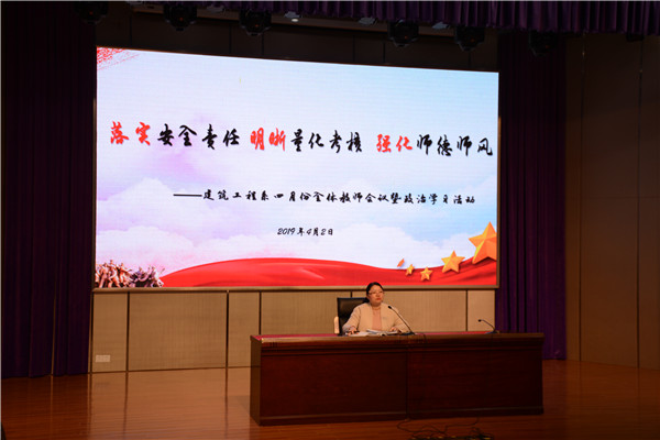 会上,建工系党支部书记、主任朱敏敏指出,开学至今,在全体师生的共同努力下,建工系的各项工作平稳有序、顺利开展,同时,她就近期各项工作作了具体部署,她主要从四个方面作了发言。一是落实安全职责,守住安全底线。她向全体教师传达了学校安全工作会议的重要精神,她再一次向大家明确了安全责任分工、安全职责内容,指出安全工作是学校的生命线,是系部的生命线,全体教师要严格执行安全工作“十五项制度”,一以贯之、一丝不苟、一着不让做好安全工作,确保系部的安全稳定。二是明晰量化考核,积极贡献系部。朱敏敏详细解读了学校《系部量化考核细则》,指出了600分基本分的具体得分要点,希望大家严守常规,扎实开展各项工作,确保基本分的有效获得,同时,她就发展分向大家作了解读,希望大家在技能大赛、教学大赛、创新创业大赛、班主任大赛、文明风采大赛等方面,突破难点,力争取得优异成绩。她希望全体教师为了系部的共同荣誉,一起齐心协力,力争上游。三是是落实教学常规,着力提升教学质量。她进一步强调了教学常规要求,强调了文化课、专业课、实训课课堂教学范式,并就课程建设、精品课程、论文评比、延时服务等方面内容作了布置安排。四是强化师德师风,提振师德尊严。朱敏敏组织大家了进行了师德师风专题政治学习活动。她向全体教师解读了《新时代高校教师职业行为十项准则》《新时代中小学教师职业行为十项准则》,她希望大家严守师德规范,牢记使命、不忘初心,爱岗敬业、教书育人,时刻自重、自省、自警、自励、自觉做以德立身、以德立学、以德施教、以德育德的楷模,维护教师职业形象,提振师道尊严。