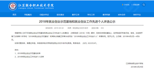 根据江苏联合职业技术学院《关于评选就业创业示范基地和就业创业工作先进个人的通知》(苏联院招〔2018〕15号)要求,我校按要求积极申报。经联院组织专家评选、审核,我校获评“2018年就业创业示范基地”,负责就业创业工作的范丽萍荣获 “2018年就业创业工作先进个人”荣誉称号。 在校党委校长室的正确领导下,在学生工作部具体指导下,在系部的努力下,近三年海门分院始终以高就业率稳居省联职院前列。在创业方面,海门分院以活动为载体,精心开设10个可是的创业课程,成立创业就业社团,组织多项创业赛事,有效团激发学生的创业激情,培养毕业生的创业意识。 海门分院学生就业创业工作以“十九大”精神为指引,在校党委、校长室的领导下,始终坚持“以服务为宗旨,以就业为导向”的办学理念,以就业促进教育教学改革,通过“走出去、请进来、多调研”的长效机制,积极开拓就业市场,创业带动就业,搭建就业平台,提供优质就业服务,走出了一条促进毕业生充分就业的新路子。
