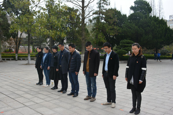 4月4日上午10:30,活动在一片肃穆中拉开帷幕。首先,全体同志默哀三分钟,向烈士们表示沉痛的哀悼。党员同志们朴素庄严、肃然有序,面向革命烈士纪念碑鞠躬致哀。全体同志聆听讲解员详细讲解革命烈士纪念碑简介和先烈的英雄事迹,并由王聪同志与张舒皓同志献上花圈。