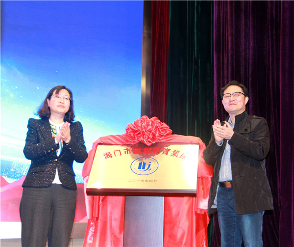 黄静还宣读了《海门市人民政府关于同意成立海门市职业教育集团的批复》,在全场与会人员的见证下,南通市教育局副局长姜学勤与黄静共同为海门市职业教育集团揭牌,全场响起热烈掌声。