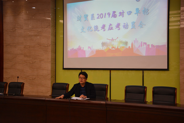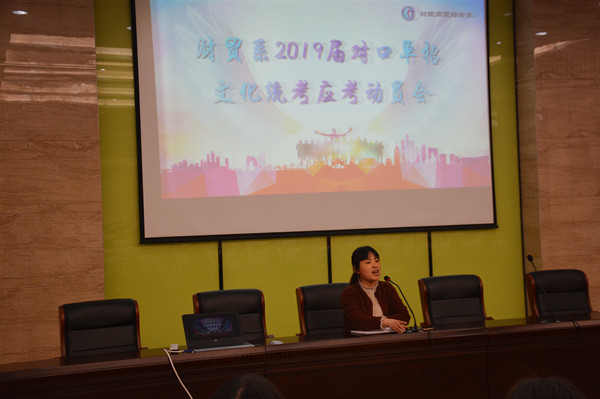 4月15日下午15:20,财贸系2019届高三全体学生在謇翁楼精匠报告厅集中,参加系部组织召开的对口单招文化统考应考动员会,会议由朱娟副主任主持。