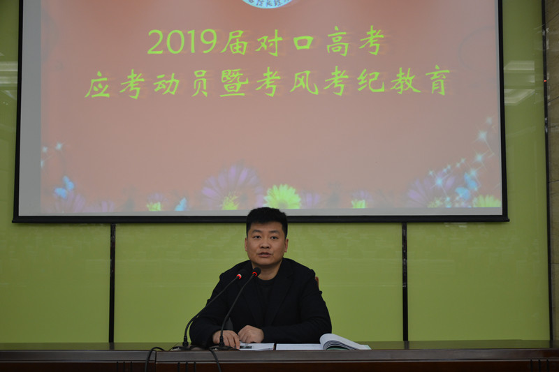 最后,江主任就2019届考生在普通高校对口单招文化统考中诚信考试做了重要指示。江主任为同学们详细解读了考生诚信考试承诺条款,并逐条解读了《考生守则》、《国家教育考试违规处理办法》、相关考试违法行为处罚规定等条款,要求同学们严肃考风考纪,做到诚信考试。