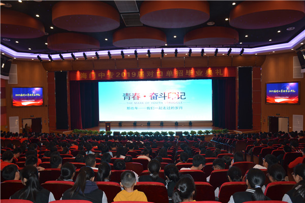 4月25日上午,海门中专隆重举行2019届对口单招毕业典礼,为即将离别母校、逐梦远航的莘莘学子集体送行。学校领导班子全体成员出席典礼,相关职能部门主任、对口单招系主任室所有人员,以及部分教师、家长和基础年级学生共900多人一起参加活动。
