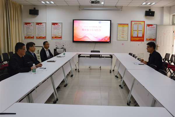 5月8日下午15:20,周桂岐副校长带领教学工作部王茂、钱玉强两位副主任,来到謇公楼226会议室,对财贸系进行期中教学常规检查,王飞主任热情接待。
