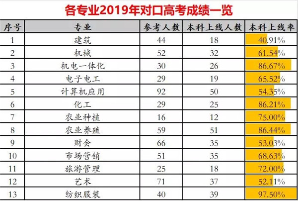 2019年对口高考成绩揭晓,海门中专604名学生参加对口高考,397名学生达本科线,本科上线率达65.73%。