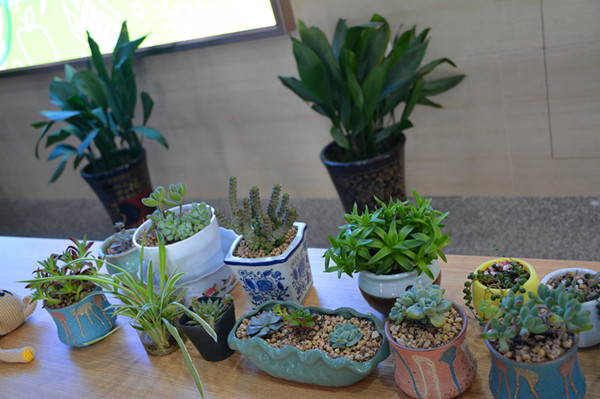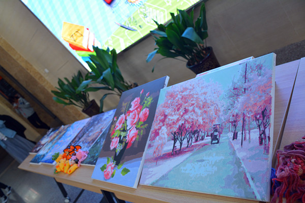 展台中间,那是一堆形状各异的小花盆,园艺社团的孩子们亲手种上了一株株小绿植,萌哒哒的,还没有长大,却拥有可劲儿的生命力,孕育着希望;展台西边上,堆着一些十字绣作品,那图案、那针脚和色泽,真是叫人喜欢的紧。展台上经贸系孩子们的作品还有很多,比如蛋袋呀、硬笔书法作品呀等等,每一样都是那么精致,那都是经贸孩子们社团才艺的精华,为孩子们的巧手点赞!