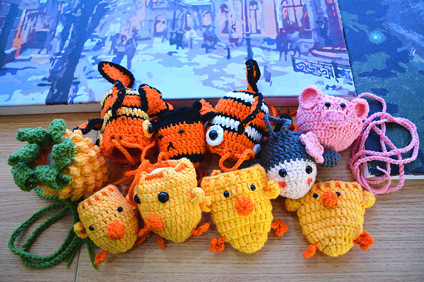 一个个毛线娃娃是编织社团孩子们的作品,那娃娃可是模样逼真、栩栩如生,带着红围巾穿着小衣服,让人忍不住想抱在怀里呢!编织社团的作品还有一块块针法别致、风情各异的三角围巾,可以想象戴上会是怎样的风情万种呢?