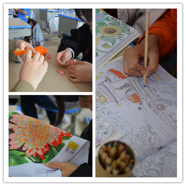 涂鸦社团的孩子们在用心的给画涂上自己喜欢的颜色,一千个人就有一千个哈姆雷特,一张张色彩鲜亮的绘画作品从孩子们的手上诞生了,每一张都是独一无二的珍品;编织社团和十字绣社团的孩子们此刻也在忙碌,一根根彩线在她们的手中慢慢变成了一件件别具一格的艺术作品,带有她们自己的创意和审美还有爱,真真让人爱不释手!