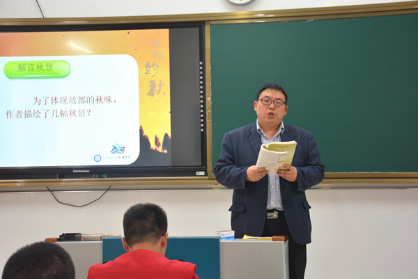 在课堂教学过程中,沈老师先从古代文人墨客对秋的描写导入,将秋之色、秋之声、秋之味展示给学生,抓住秋味,诠释故都的秋“清、静、悲凉”的特点。课堂上,诗文迭出,充满诗意;书声琅琅,互动良好;讲解透彻,环节清晰,体现了教师扎实的基本功,娴熟的课堂驾驭能力,取得了良好的示范引领效果。