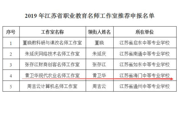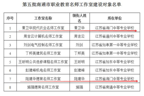 根据《市教育局办公室关于开展省市级职教名师工作室遴选暨市级中职名师工作室评估验收工作的通知》(通教办函〔2019〕45号)精神,经学校申报,市教育局、财政局资格审核和公开评审,我校黄卫华现代农业名师工作室和陆建华德育名师工作室被确定为第五批南通市职业教育名师工作室建设对象。同时,黄卫华现代农业名师工作室被南通市教育局推荐参评2019年江苏省职业教育名师工作室建设对象。 我校的名师工作室建设呈现出蒸蒸日上的景象,至此,学校已有省级名师工作室4个,市级名师工作室6个。名师工作室充分发挥了名师的示范、辐射和指导作用,实现了资源共享、智慧生成、全员提升的目的,培养了一批师德高尚、造诣深厚、业务精湛的教师。后期,在名师工作室建设方面,学校将进一步拓展思路,打造特色,力促教师专业成长。(徐杨帆)