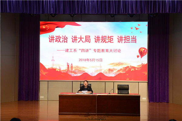 5月15日上午,建工系围绕“讲政治”、“讲大局”、“讲规矩”、“讲担当”四个专题开展专题大讨论活动。本次专题讨论由建工系主任、党支部书记朱敏敏主持,建工系全体教师参加活动。