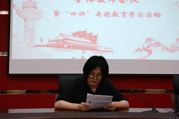 第二项议程由党员代表陈泓宇、曹怡两位老师进行发言。两位党员纷纷表示要以“四讲”标准历练、塑造、打磨自己,争当模范,成为“学”的示范、“做”的表率。培养自己扎实的理论功底和业务能力,不断提高服务水平,当好党员干部和人民群众的贴心人。