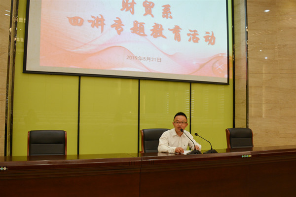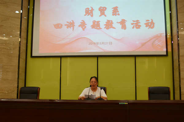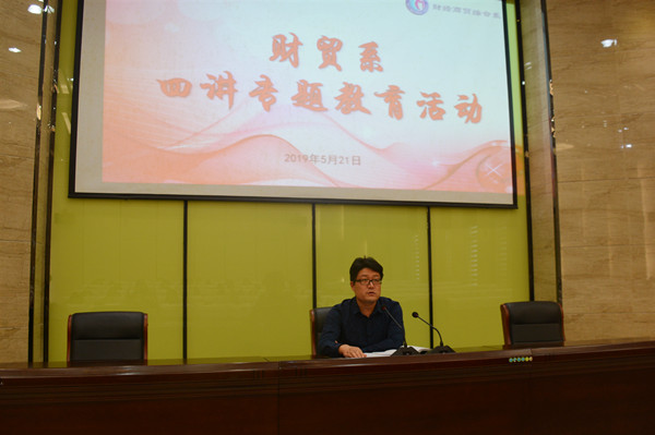 为深入贯彻全国教育大会和习近平总书记在学校思政课教师座谈会上的重要讲话精神,落实中共海门市委十四届七次全会及2019年全市教育工作会议精神,根据学校党群工作部统一部署和安排,财贸系于5月21日上午9:20,在謇公搂名匠报告厅组织开展了“四讲”专题学习教育活动,系部全体教师准时参加,活动由王飞主任主持。