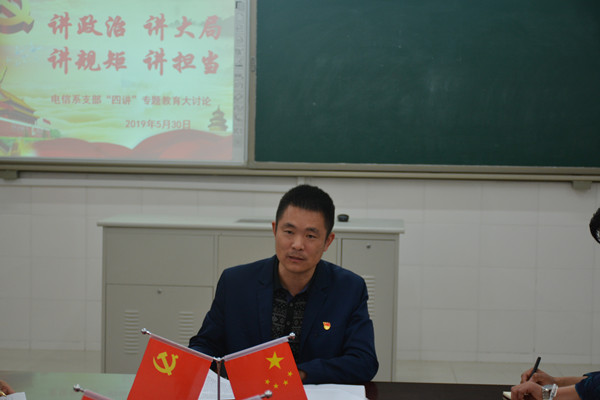 为深入贯彻全国教育大会和习近平总书记在学校思政课教师座谈会上的重要讲话精神,引领全系教职员工进一步牢固树立政治、大局、规矩、担当意识,深入推进师德师风建设,电信系党支部在E楼118室召开“四讲”专题教育活动。