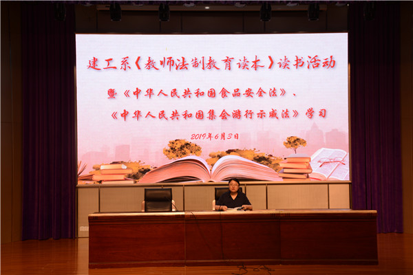 为进一步加强学校法制宣传教育,增强教师的法制观念,强化对学生的行为规范教育和管理。6月3日下午16:00,建工系组织全体教师开展了《教师法治教育读本》读书活动暨《中华人民共和国食品安全法》、《中华人民共和国集会游行示威法》学习活动。会议由朱敏敏主任主持。