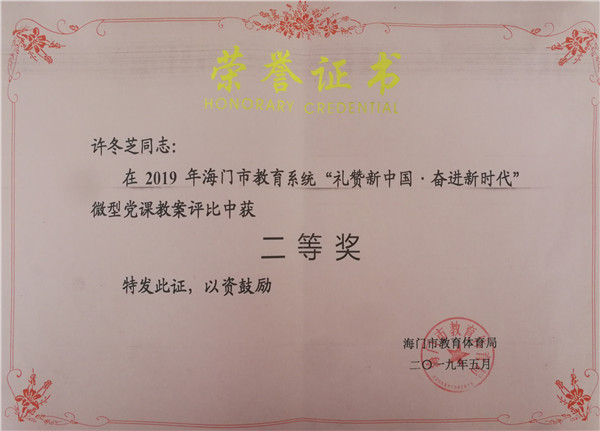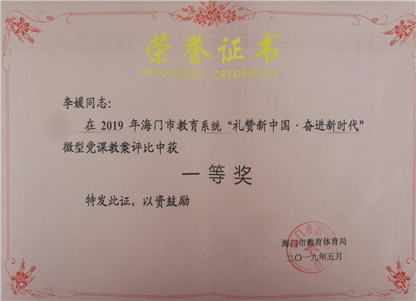 在2019年海门市教育系统“礼赞新中国?奋进新时代”微型党课教案评比活动中我校获得佳绩,电信系党支部李媛同志在党课教案评比中获一等奖,信息系党支部许冬芝同志获二等奖,在此向获奖的党员同志表示祝贺! 我校各支部均重视党建工作,无论是比赛还是活动,展示了各支部强烈的政治担当!今后,希望更多的同志参与到党建活动中去,用良好的党员综合素养开创海专新局面!