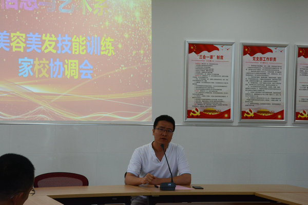 会上,系部副主任陈建华首先对各位家长百忙之中抽出时间参加此次会议表示热烈的欢迎。接着,陈主任指出当初成立美容美发技能小组的目的是为了拓展学生素质,培养一专多能的学生,适应市场需要。接着,他向各位家长汇报了技能小组的整体训练情况:在师资方面,系部聘请校外专业老师进行精心指导,系部直接管理。在学习进度方面,美容美发技能小组经过四个月的学习和训练,有多个学生已经进入了状态,基本能够独立完成单项任务。在后期训练方面,陈主任就下学期即将到来的技能大赛,与家长协商暑期培训安排,希望利用暑假一个月时间在系部直接管理下,对技能小组进行强化训练,争取完成所有训练任务,达到参赛能力。