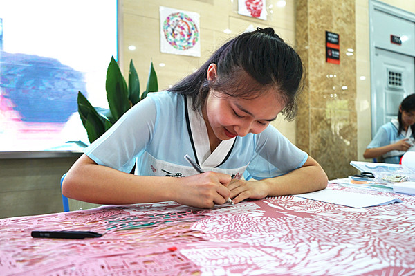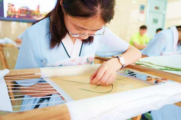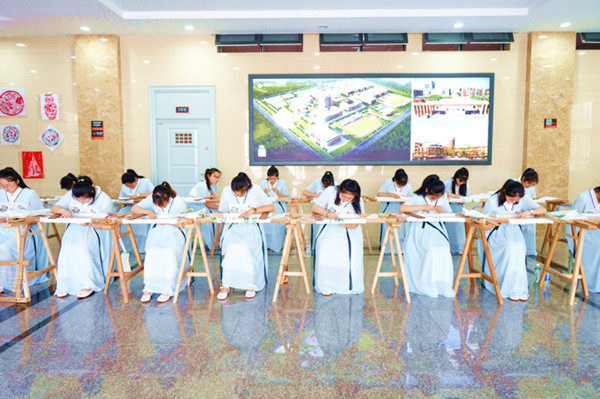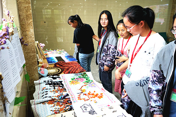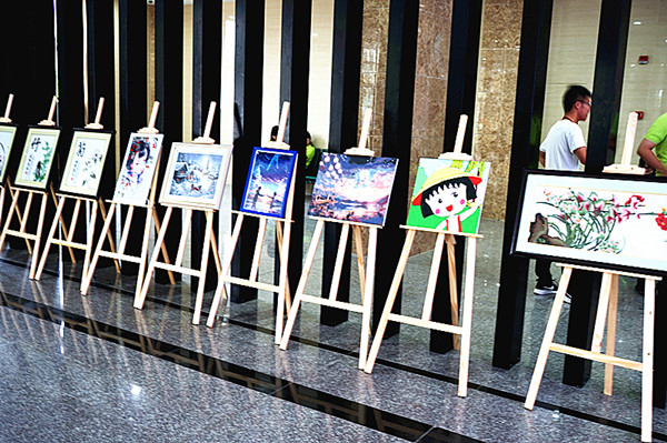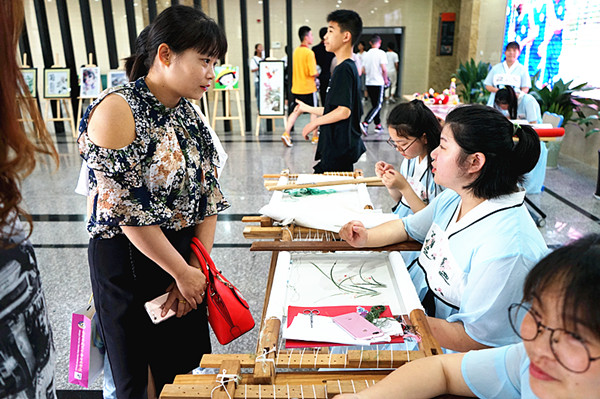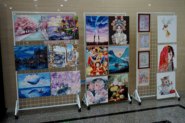 经贸学生的社团作品展示安排在C2楼底楼西大厅。偌大的底楼大厅缤纷无限。系部大屏幕上循环播放着本系“ET篮球社”队员篮球赛的形象视频,那些个赛场上奔跑着的飒爽少年吸引了众多毕业生和家长的眼球。再看展示台上、挂栏上、木架上都有序的排列着经贸学生在社团里学习完成的各种作品。数字油画、钻石画、铅笔画、十字绣、沈绣还有硬笔书法、剪纸、DIY手工作品和优秀的习作,他们无不展示着我们经贸学生的艺术才华。沈绣社团穿着汉服的“小姐姐”们正现场进行着针法的演示呢!考生和家长们都驻足仔细的端倪,为经贸学子的优秀作品点赞称奇!学生们对美的感知和追求,再加上细致和耐心成就了一幅幅令人惊叹的艺术作品。在场的家长都深深的感叹,我们职校学生和普高学生一样的聪慧!一样可以用心成才。