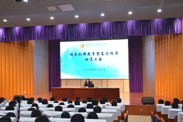 为进一步加强期末常规管理,强化学生的纪律观念和学习意识,提高期末复习迎考效率,6月20日下午14:30,机电系组织学生在文苑报告厅召开期末纪律教育暨复习迎考大会。机电系主任吴樱樱主持会议并发表讲话。