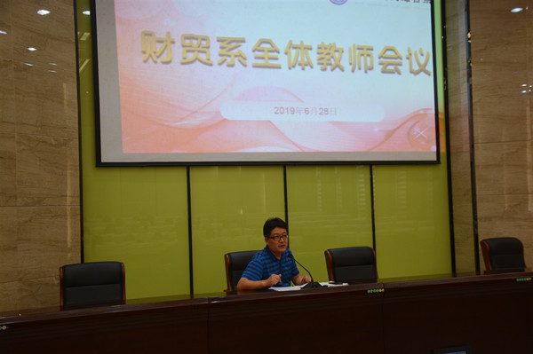 6月28日上午9:25,财贸系在謇公搂名匠报告厅召开系部全体教师会议,会议由王飞主任主讲。