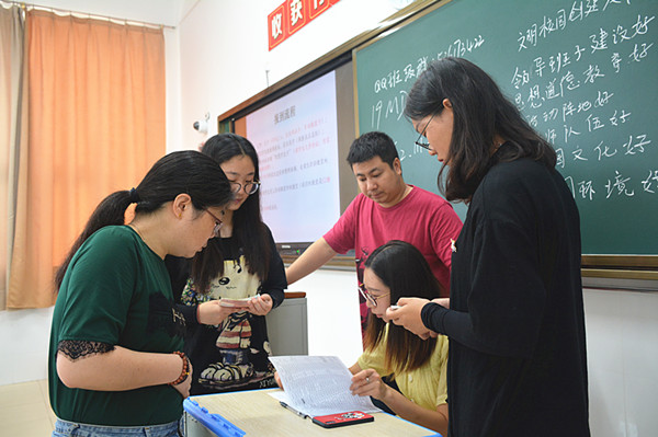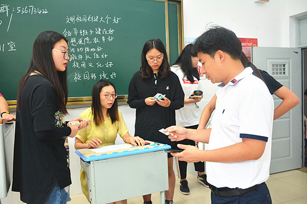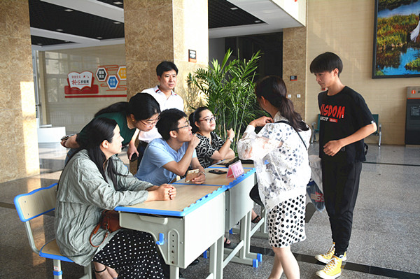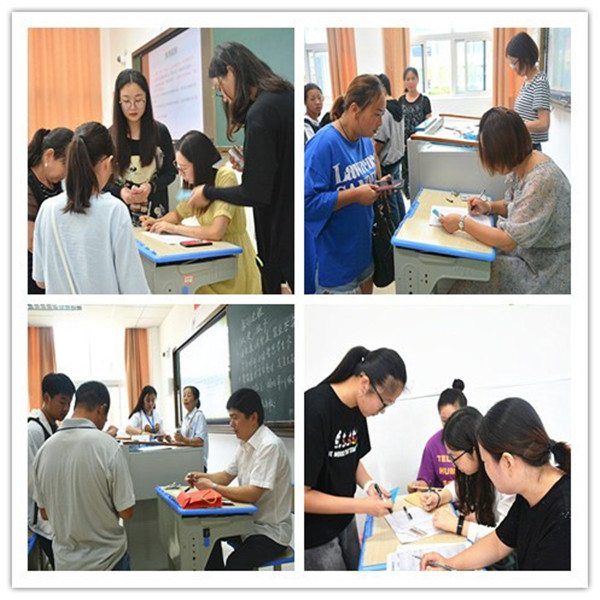 骄阳似火,天气闷热,新生们在家人和朋友的陪伴下来到了经贸系。迎新志愿者统一着装,热情的微笑,耐心的讲解,细致的引导,带领新生顺利找到自己的班级。各班主任与配班老师密切合作,各司其职,认真仔细地做好学生的信息核对、收费、特异体质的调查、军训服装的发放等工作,并耐心回答家长、学生提出的问题。由于准备工作充分,整个报到工作秩序井然,8:00新生报到接待工作基本完成。