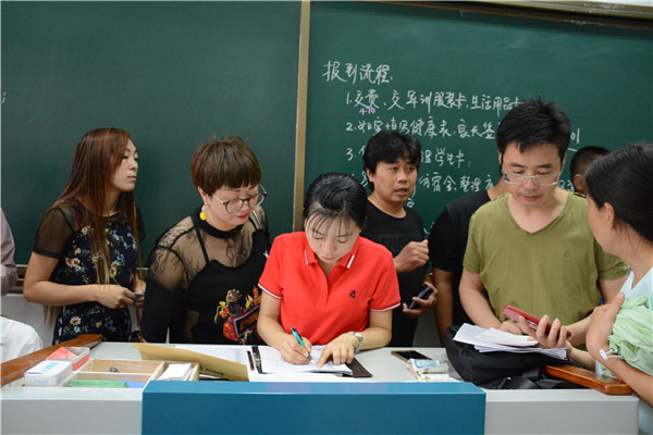 7点左右,报到高峰期,19级各班主任、配班老师一边招呼新生完成报到手续,一边耐心解答学生和家长的疑惑。现场秩序井然,忙而不乱。