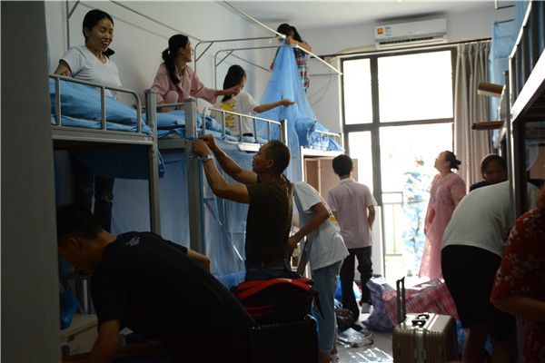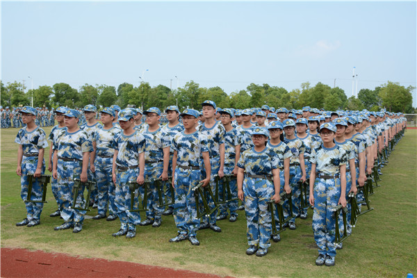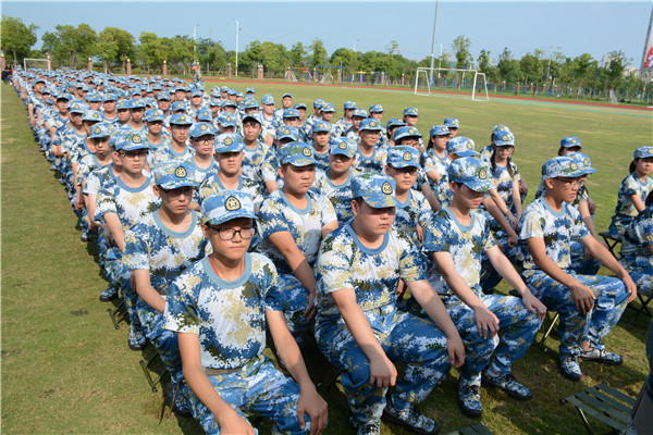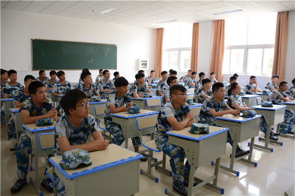 8点,各班学生报到工作基本完毕,班主任带领学生初步熟悉生活区域,指导学生整理宿舍、床铺、换穿军服,上好军训第一课。