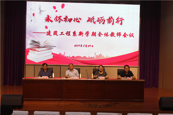 8月29日上午9:30,建工系在文苑楼报告厅,召开了新学期全体教师工作会议,蹲点副校长陈小军、建工系主任朱敏敏、副主任张永辉、邹熊冰以及全体建工系教师参加了会议。