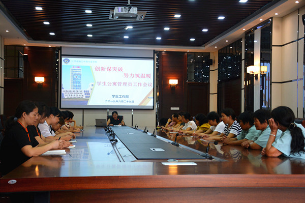 新学期已经开始,为能更好地提高学生公寓楼管理服务质量,8月29日上午9点,学生工作部在A楼阿里厅召开了新学期学生公寓管理员工作会议。学工部副主任李建英、全体学生公寓管理员和宿舍保洁员参加了会议。 会议上,学工部副主任李建英明确了本学期学生公寓管理工作的总体目标,并对开学初公寓楼的管理工作提出详细要求。 李主任以“窗口”这个关键词为切入点,明确了宿舍管理工作的重要意义:宿舍管理是树立学校良好形象的一个平台,是学校德育工作不可分割的组成部分,也是学校对外宣传的一个窗口。 接着李主任明确了本学期宿舍管理工作的总目标:安全、有序、舒适、方便。李主任指出,我们全体管理员和保洁员要努力做到改变能改变的,完善不好改变的,要将向师生提供满意服务作为自己工作的最高目标。李主任强调全体工作人员要将安全放在工作首位,做实做细宿舍安全排查工作;牢固树立服务理念,在工作中密切关注学生动态,加强与班主任沟通;严格内务和纪律要求,真正做到公平公正、一丝不苟;积极发扬奉献精神,增强服务意识。 会议最后,李主任对开学初的宿舍管理工作进行指导,强调了“对口管理、责任到人、任务到点、管理到位、服务到边”的总体要求。 会后,公寓管理员们纷纷表示要在学校领导的指导下不断加强自身能力素养的提升,共同努力,为营造和谐校园贡献自己的一份心力。(黄 娟)
