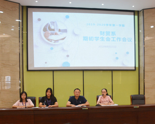 8月31日下午,财经商贸综合系学生会在名匠报告厅召开2019-2020学年第一学期学生会工作会议。参加本次会议的有财贸系施黎华副主任、徐杨帆科长,学生会主席吴津津、副主席殷佳慧,以及财贸系全体学生会成员,本次会议由施黎华副主任主持。