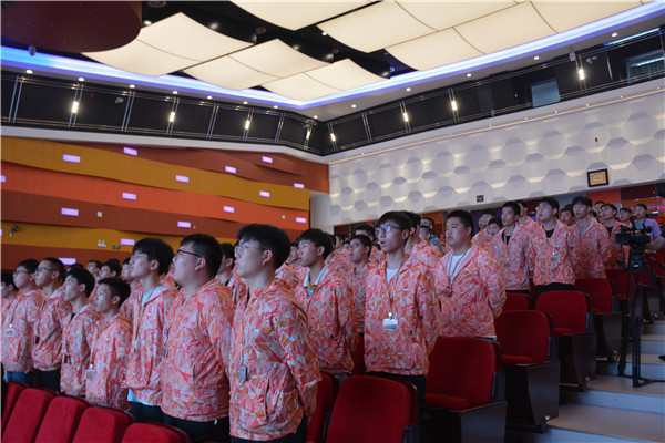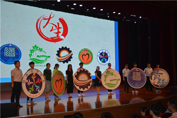 系部主任逐一上台解读各自的德育理念,组织学生齐声高喊,一句句励志口号不断响彻謇公湖科教大会堂的直播现场。