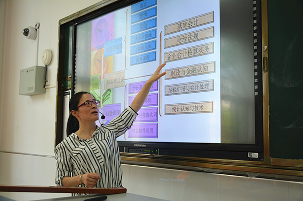 何小华老师从“为啥学”、“学什么”、“怎么学”为会计电算化专业的学生分析了本专业在社会上的地位和发展前景、培养目标、专业的课程设置、职业岗位等,让学生清晰的认识到自己将要学习的知识和努力的方向。