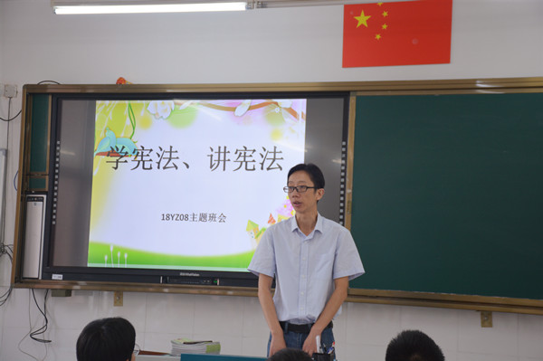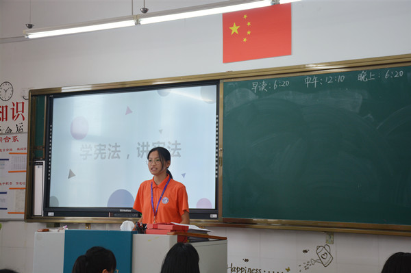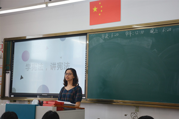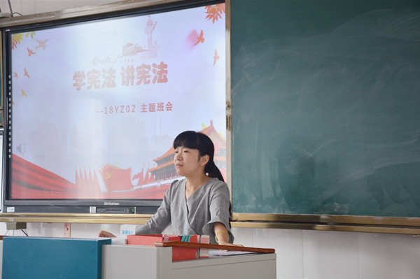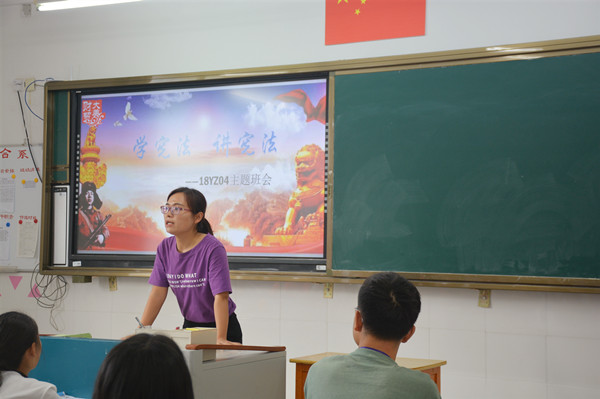 班会活动主题鲜明,形式多样。首先,各班班主任带领同学们一起学习我国的根本大法《宪法》,了解其对我国法制管理起着至关重要的作用。接着,教师以讲解、问答、案例分析等形式,向学生进行宣传教育。同学们在老师的引导下积极参与交流和讨论,更加明确了《宪法》是我国的根本大法,是其他法律的依据,感受到了学习宪法的重要性。最后,班主任进行总结发言,“法令者,治之具,而非制治清浊之源也。”当代学生应以学宪法、讲宪法为荣,以宣传宪法为己任,为促进和谐社会目标的实现贡献出自己的力量。