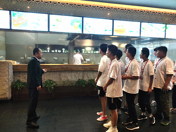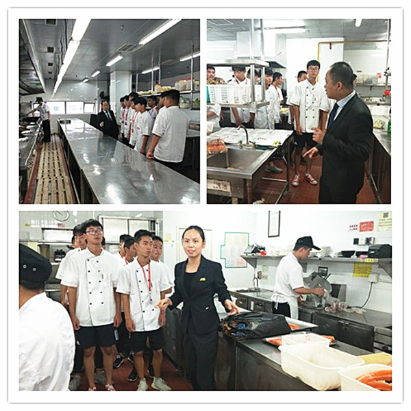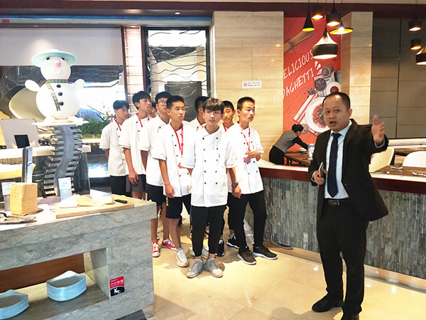 东恒盛大酒店陈焕智经理接待了施一行,对前来参观的学生致简短的欢迎词,鼓励学生用心学习,感受企业氛围,早日融入东恒盛大家庭。学生们分成三组,在东恒盛员工的带领下,较为全面地参加了东恒盛各厨房、宴会大厅和各类特色餐厅。
