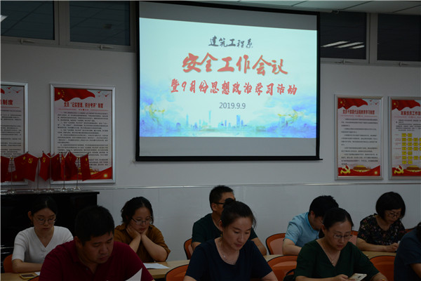 安全工作是学校的头等大事,是学校生存和发展的生命线,为进一步做好系部安全工作,切实维护校园安全稳定,9月9日下午3:45,建工系在214会议室,组织召开了安全工作会议暨9月份思想政治学习活动,建工系全体教师参加会议。