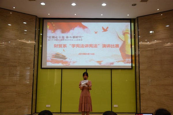为弘扬宪法精神,增强学生法治观念,扎实推进法治教育工作,9月16日12:30,财贸系在D楼名匠报告厅举办了“学宪法,讲宪法”主题演讲比赛。财贸系施黎华副主任、徐杨帆科长及部分语文教师担任了此次比赛的评委,学工处张海华主任作为嘉宾观摩了比赛全过程。