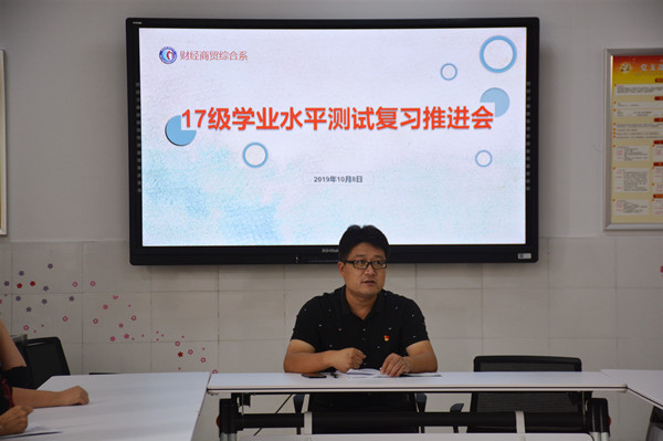 为更好迎接江苏省2019年中等职业学校学生学业水平考试,10月8日上午9:15,财贸系于D226会议室组织召开了17级学业水平测试复习推进会。财贸系主任王飞、副主任朱娟及相关任课教师共同参加此次会议。
