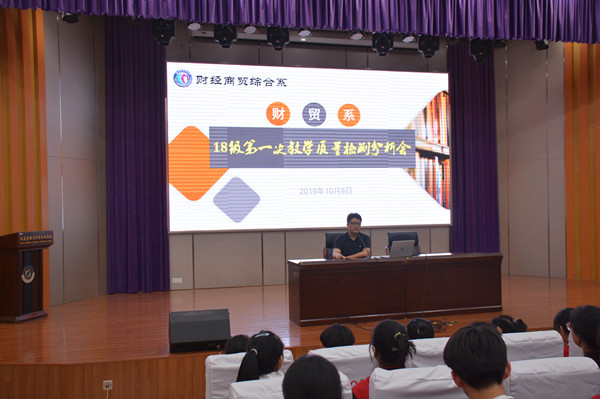 为了更好总结开学以来教学工作,及时查漏补缺以求不断提高教学质量,10月8日中午12:25,财贸系18级第一次教学质量检测分析会在B楼文苑报告厅召开,王飞主任主持会议并主讲。