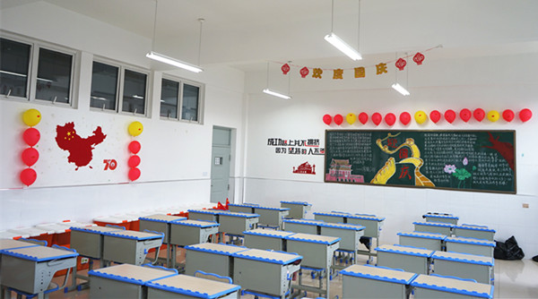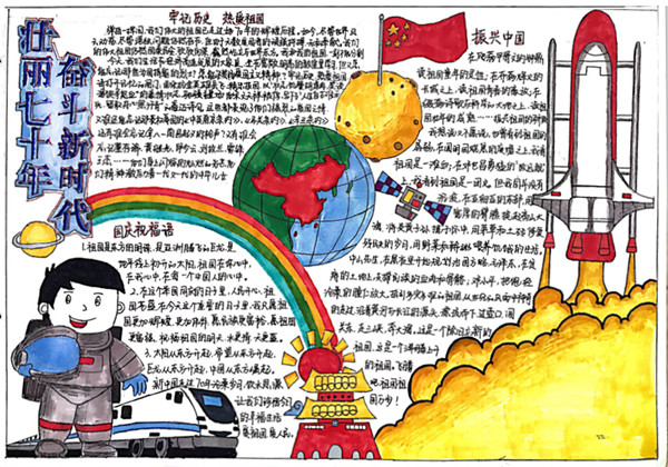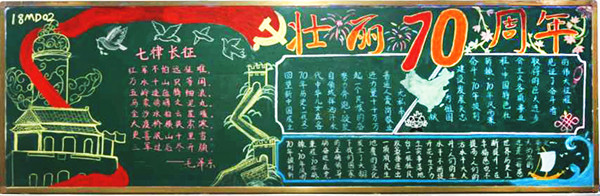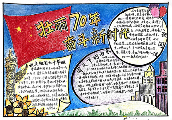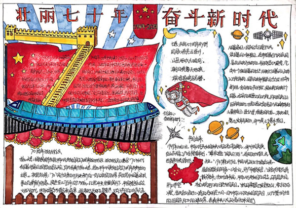 根据新学期德育主题活动安排,学工部组织各系部以“我和我的祖国”为主题,营造庆祝中华人民共和国成立70周年国庆氛围。近期,同学们以制作手抄报,设计出刊黑板报、电子班牌,布置教室等形式积极营造国庆氛围,为祖国母亲献上“生日礼物”。 画笔下的喜庆“国庆”。简单而漂亮的手绘,在8开的画纸上呈现的是同学们心中的“国庆日”,鲜艳的底色上用粗线条描绘的“70”字样,大气而热烈;随风飘扬的国旗将红色辐射至画报的边边角角,从“1949年”到“2019年”,跨越出“奋斗”70年的壮丽。如果色彩泼洒的是举国欢庆的心情,那么文字抒写的就是我们内心炽热的骄傲。 手抄报、画报是生动的,黑板报设计却也有着不一样的形象。在墨绿底色的黑板上,同学们用粉笔、颜料设计出了各具风格的“国庆”。精致的版面设计、别具一格的报头、精心编纂的文稿:无不表达了同学们的爱国热情。 经贸系还组织了国庆氛围布置评比活动,各班在班主任的策划下,对教室进行装扮。红色的中国版图、鲜艳的五星红旗、心形的紫红气球和条形彩带再加上身穿橘红色班服的同学们,人与景自然结合,氛围热烈而喜庆。 国庆节,是举国欢庆的日子,而国庆氛围,我们这样来营造……(黄娟)