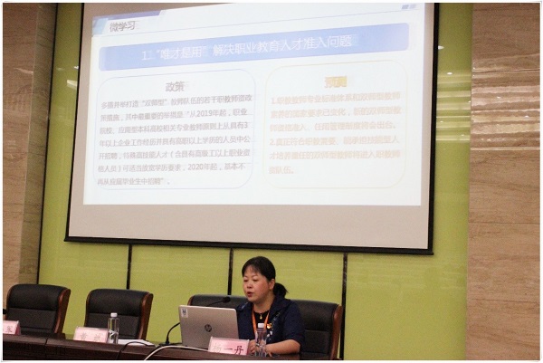 随后,全体教师在E楼录播教室举行了专业阅读分享会,盛婷婷、沈晶晶、陈晓红等老师分享了自己的读书所得,观点鲜明,内涵丰富,气氛轻松而热烈。 中心组对下阶段的工作进行了安排,杨一丹及钟蔚分别做了学科课程建设及平台课程建设的培训,希望能集中全市英语老师的力量,进行英语学科的资源库建设,为教学大赛做好未雨绸缪的工作,也为英语学科的教师创新团队建设打下基础。 2019年江苏省职业院校教学大赛一等奖选手黄文娟老师给大家做经验交流。黄老师介绍了比赛流程,重点讲述了自己在准备阶段和参赛过程中的心得体会及经验教训。之后黄老师进行了获奖课的实例展示,黄老师稳定扎实的基本功,先进合理的教学设计获得了老师们的一致称赞。 最后,南通教科院职教教研员黄斌老师进行了活动总结。她希望,全体英语教师要抓住课堂这个主战场,扎扎实实的抓好基础教研,踏踏实实的提升教学基本功,为提升南通市职业教育质量作出贡献。 本次活动为教师们搭建了一个拓展视野、共同进步的平台,也为进一步提升我市职业学校英语教师的教学水平做出了积极探索。(图文:沈晶晶)
