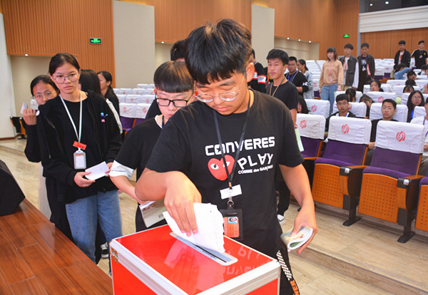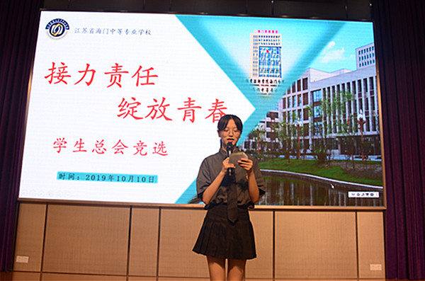 为选拔出新一届学生总会干部团队,顺利完成学生干部的新老交替,保证学生会工作的连续性,10月10日晚6点30分,学生总会在B1楼文苑报告厅,举行“接力责任 绽放青春”学生总会换届竞选活动。学工部副主任李建英、学生总会全体成员参加了竞选活动。 首先进行的是竞选演讲,副主席沈天周在演讲中表示不会忘记使命与任务,并以“一个是出发点,一个着力点,一个支撑点,一个落脚点”分享了对学生总会工作方向的理解;文宣部部长张佳慧,热情洋溢的演讲中饱含着强烈的责任意识,她表示要以服务学生为宗旨,提升自身能力,为总会的发展添砖加瓦;劳卫部部长沈凯伦则从实际出发分析了自身和学生会工作中的不足之处,他用一段真挚的演讲赢得了观众的阵阵掌声;宿管部董琦同学竞选宿管部副部长一职,她希望能用自己的耐心和毅力,为全体寄宿生提供优质服务。 随后,全体学生总会成员秉承公平公正的竞选原则,慎重地为竞选选手进行了投票。 最后,学工处副主任李建英主任对学生总会提出要求。李主任对总会的工作细节、工作原则、工作态度进行了强调,她表示对总会的未来充满期望,并希望总会能成为一个组织规范,作风公正,人人称赞的优秀团体。 此次竞选活动展现了竞选者的能力,同时极大地鼓舞了学生会成员的工作热情,为今后学生会的发展奠定了良好坚实的基础。我们也相信当选的同学定能成为新一届学生会的中流砥柱。(学宣部)