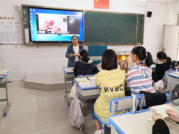 实践操作开始了,大家拿出带来的心爱装备,剪刀、刻刀还有火红的专用纸,开始了剪纸之旅的第一程——“我的五角星”。五角星,又称五芒星,是指一种有五只尖角,并以五条直线画成的星星图形。要精确地画五角星,徒手是不可能的。在一些画上,有时不精确的五角星反而给人轻松的感觉,但是在国旗、国徽、商标上,五角星必须是完全精确的,五角星任意一条线段上的比必须等于黄金分割点。我们怎样用手中的一纸一剪剪出既漂亮又严整的五角星呢?认真聆听讲解后,同学们跃跃欲试,纷纷剪出属于自己的别样精彩,争相竞夺今天“第一剪”的桂冠。(孙春娟)