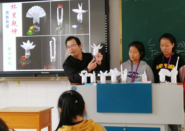 同学们最感兴趣的还是实践操作环节。大家纷纷拿出早已准备好的餐巾和口杯,跃跃欲试。折叠“四叶荷花”,这就是第一课的重点学习任务。在众多折花花型中,这一种是比较简单的一种,适合大家先打打基础。同学们首先观看完整“四叶荷花”折叠过程视频,然后跟随老师的分解动作进行练习,很快掌握了相关技术要领。掌握一种技能实质上是一种熟能生巧的过程,同学们从知道怎么折到真正会折,还需要在课后强化反复练习,以便在下一节社团课上进行展示评比。(施建峰)