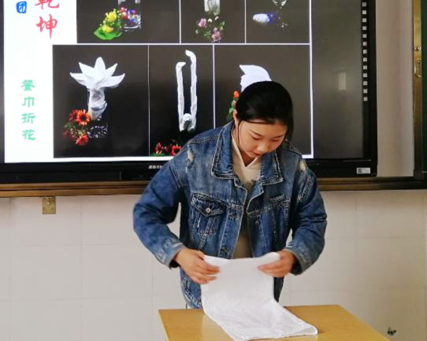 社团的第一课,同学们首先了解了餐巾折花的作用和意义。餐巾折花是餐前的准备工作,即服务人员将餐巾折成各式花样,插在酒杯或水杯中,或者放置在盘碟中。这既美化了餐桌,体现了宴会的等级,又可供宾客就餐时使用。接着,参加技能大赛的同学为全体成员展示了餐巾折花的过程。10种花型,4分钟,在同学们的惊叹声中,栩栩如生花鸟造型便跃然于杯中。