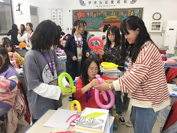 最精彩的是主体造型步骤。造型样式丰富多彩,有单个气球就可以完成的,更有需要两个编扎在一起的。我们最先学的是小狗造型,需将气球扭来扭去,一般旋转两到三圈,转多容易爆炸,转少了可能会容易散掉。此外还要控制好一定长度,不然你的狗将会出现四只腿不一样长的情况。